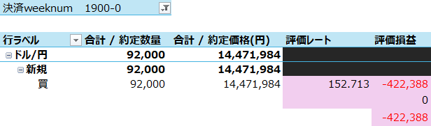 先週末の買い建残は96千(24件)でしたが、先週建てた玉5つのうち4つまでが決済され、また現在のルールでは毎週7件の新規買い玉増を許していますが、金曜日の晩に子供の塾のお迎えしつつ建玉メンテしていた際、円安方向に大き目に動いたので新規両建てエントリーしたのでした。即座に1件の離脱をしなければならなかったのですが、子供が塾から出てきたので「あとでやろう」と思って忘れていたのでした。相場が円高に動いて売り玉が買い決済した通知で「しまった」と思いましたが後の祭り。まぁそういうこともありますよね。ということで、今週建てた買い玉残は8件、先週までの建玉で決済されたのが9件、差し引きした買い玉残は、23件。 4千*23=92千。売り玉は残らず。
