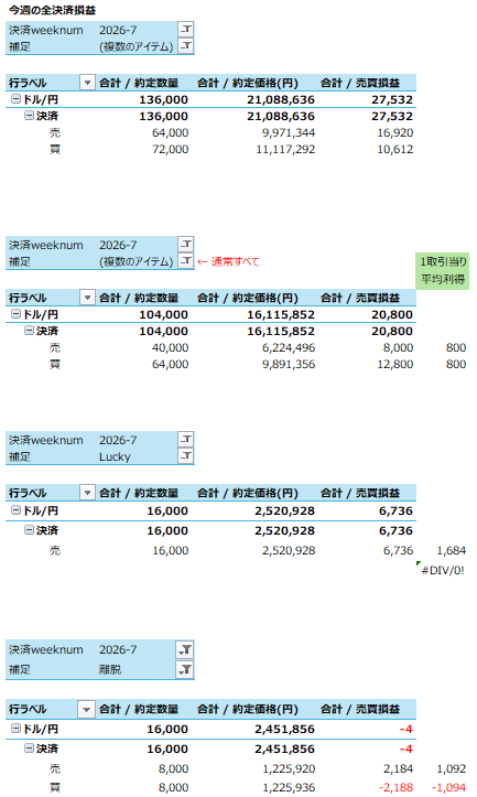 日別の決済損益を記録しておくと、月曜 13,936円、火曜 2,400円、水曜 1,600円、木曜 6,408円、金曜 3,188円、でした。