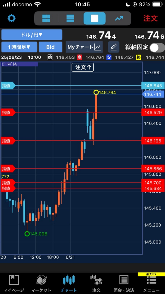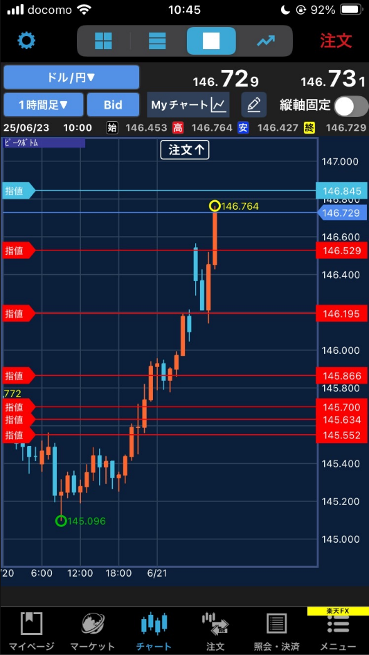 この日はその後どんどん円安方向に進んだわけで、たとえば、この瞬間で Bidが 146.382 だから、一番下の145.552 とは 0.83もの距離があるから、約定するはずがない、となる。