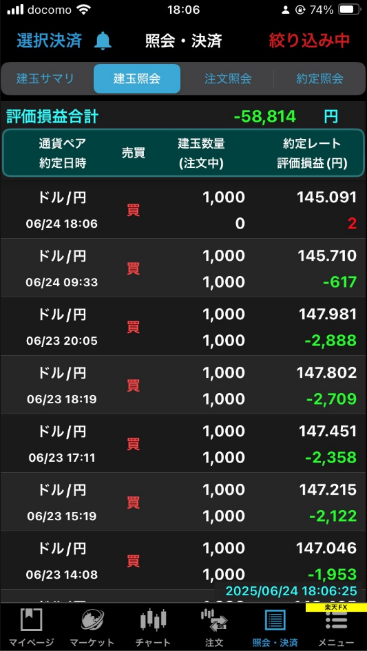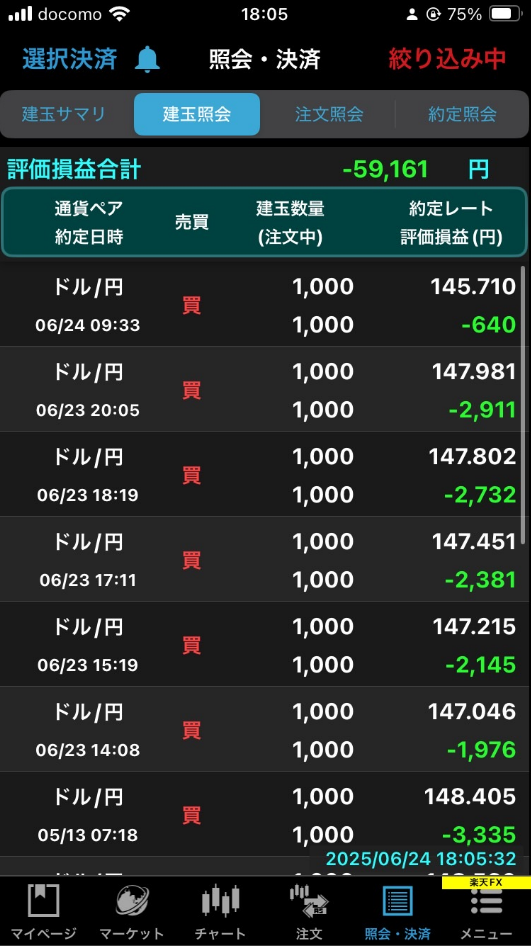 もっと具体的には、この画面で、6/23(月)に約定した買い玉が5件あるが、これは仕掛けをずらしていったから。だからこれらは先週末時点ですでに持っていたリスクであるとカウントしてよい。