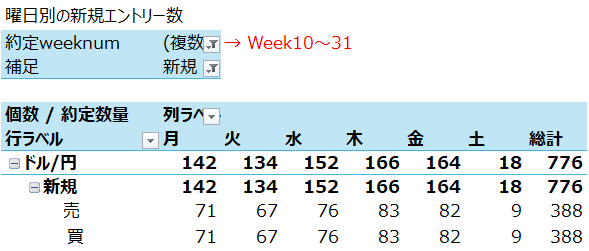 火曜日のほうが少ないのが意外だけど、これは一番最初の第10週の月曜日に、まだルールが決まってなかったため、一週間に建玉を5つふやしてよいということで、一日目で5つエントリーしてしまい、たぶんそのことも手伝って往復ビンタが一つきまって、もう1件エントリーしていました。
