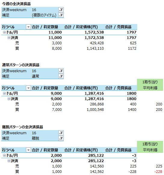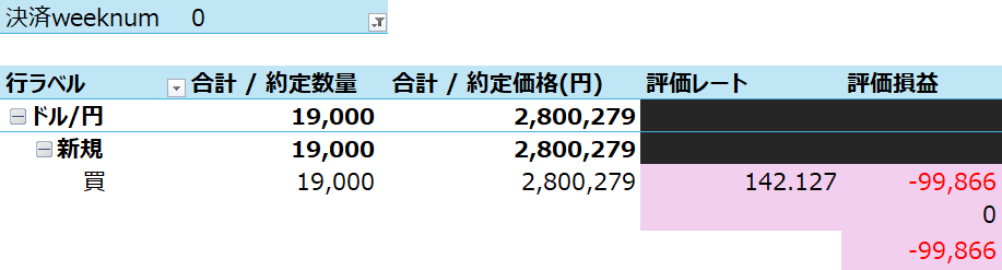 建玉残ですが、今週はほぼ単純に円高方向に進行した週だったので、先週積み上げたの14単位はまったく決済されず、今週しかけた買い玉5単位が足され、19単位(=19,000ドル)残りました。