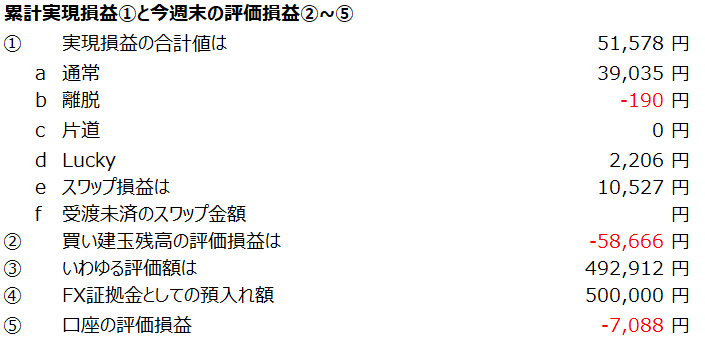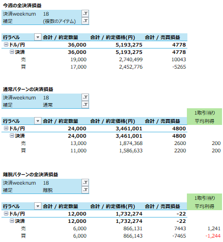 今週月曜日陰線で400円、火曜日はほとんど相場が動かずなんと0円、水曜日も200円にとどまりました。木曜日大きく円安へ振れたので古い買い玉が決済されたり、その日仕掛けたのがいくつも決済されたりと、2,588円の儲け。金曜日もそこそこ相場が動いて1,604円の儲け。