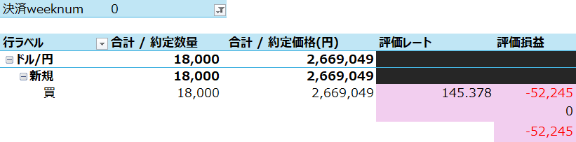 建玉残ですが、今週も週足が陽線だったので、先週末の買い玉17単位のうち4単位が決済され、今週5つ積み上げたので、買い玉残は18単位。