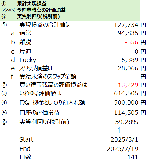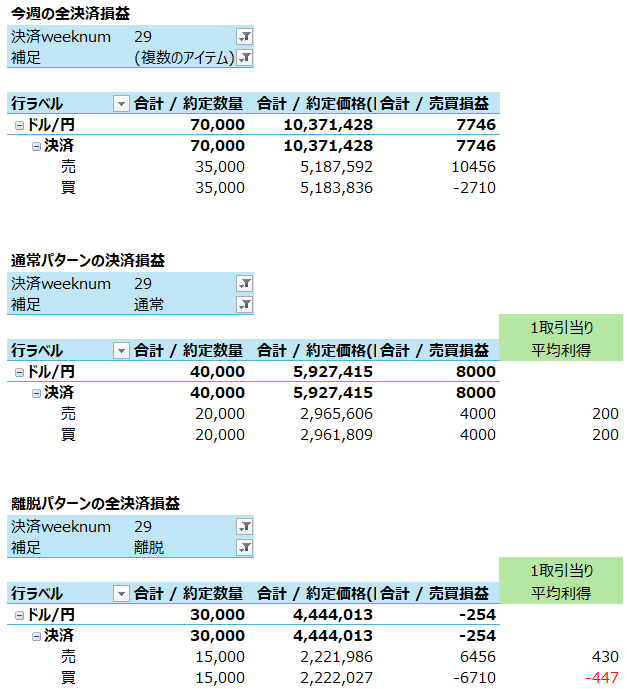 サヤ抜きでは一週間で7,746円と、先週初めて7,162円で7千円台に乗ったのと考え合わせてもなかなか良い週だったようです。スワップは1,268円とやや減りました。買い玉がどんどん決済されていったので。