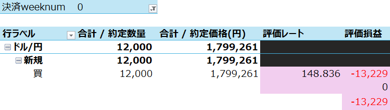 先週末に比べ、買い玉の評価額が@1.412円も円安方向に動いたので建玉の評価損が大きく減少し、