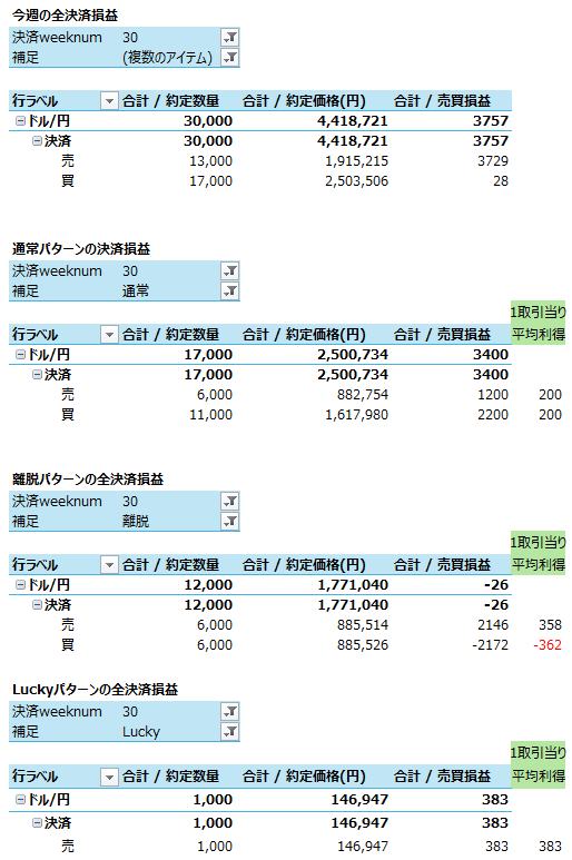 ということで、週の決済損益は3,757円と低めの数値となりました。スワップは1,360円。