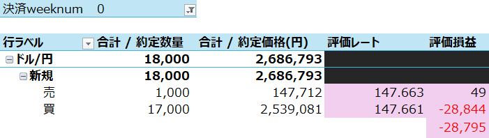 先週末に比べ、買い玉の評価額が@1.175円も円高方向に動いたので建玉の評価損が大きくなり、