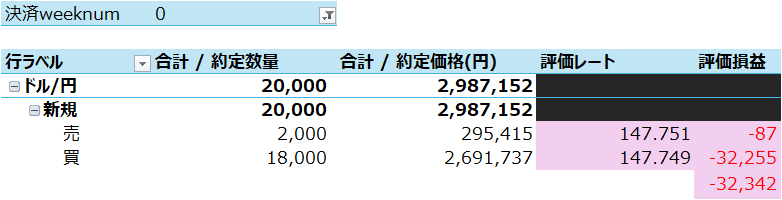 先週末の金曜日に大きく円高方向に振れて一週間が終わったので、売り決済待ちの買い建玉が遠く、通常の売り決済は6件しか約定しませんでした。。