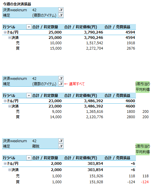 日別の決済損益を記録しておくと、月曜 1,194円、火曜 1,400円、水曜 600円、木曜 600円、金曜 800円、でした。週間のスワップは、990円。