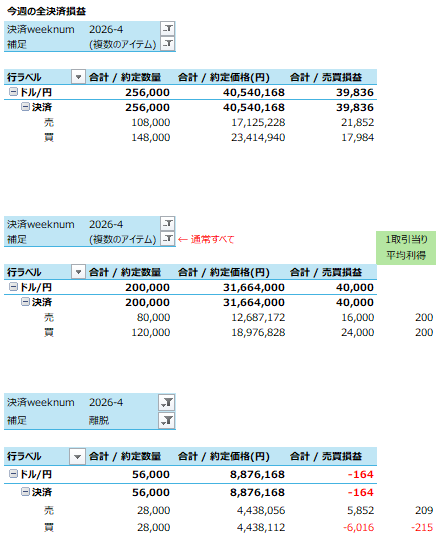 日別の決済損益を記録しておくと、月曜 4,000円、火曜 10,356円、水曜 1,600円、木曜 8,748円、金曜 15,132円、でした。