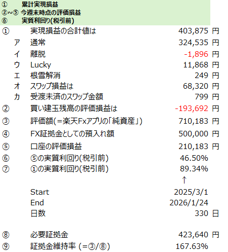 とはいえ、⑤も少しは気になるわけで、評価損益も含めた⑥実質利回りは、+46.50% となりました。