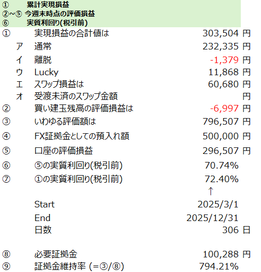 スワップを除く決済損益は(ア)~(ウ)の合計で242,824円だから、1月あたり24,282円。