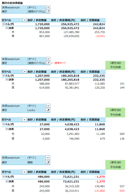 うち、離脱は243ですので、Luckyも含めた通常の取引は610あったことになりますね